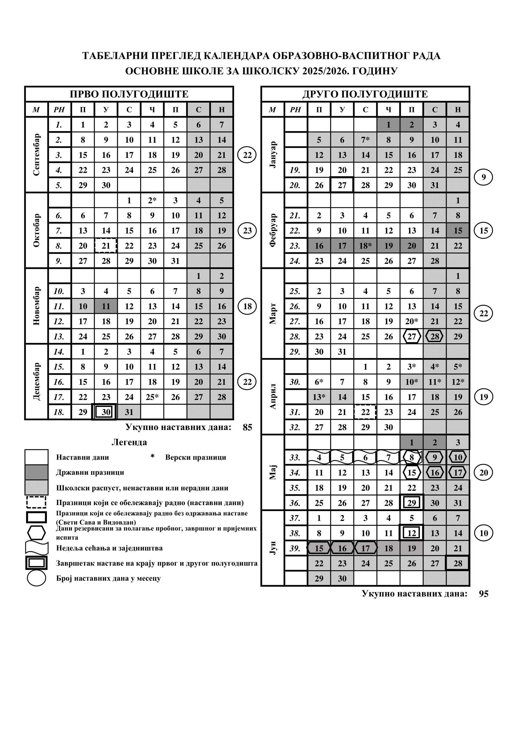 ШКОЛСКИ КАЛЕНДАР ЗА 2025/2026. ГОДИНУ